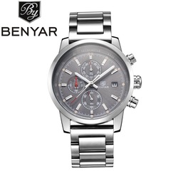 벤야르 5102 패션 스포츠 크로노그래프 스테인레스 스틸 스트랩 수츠 브랜드 손목 시계 Relogio